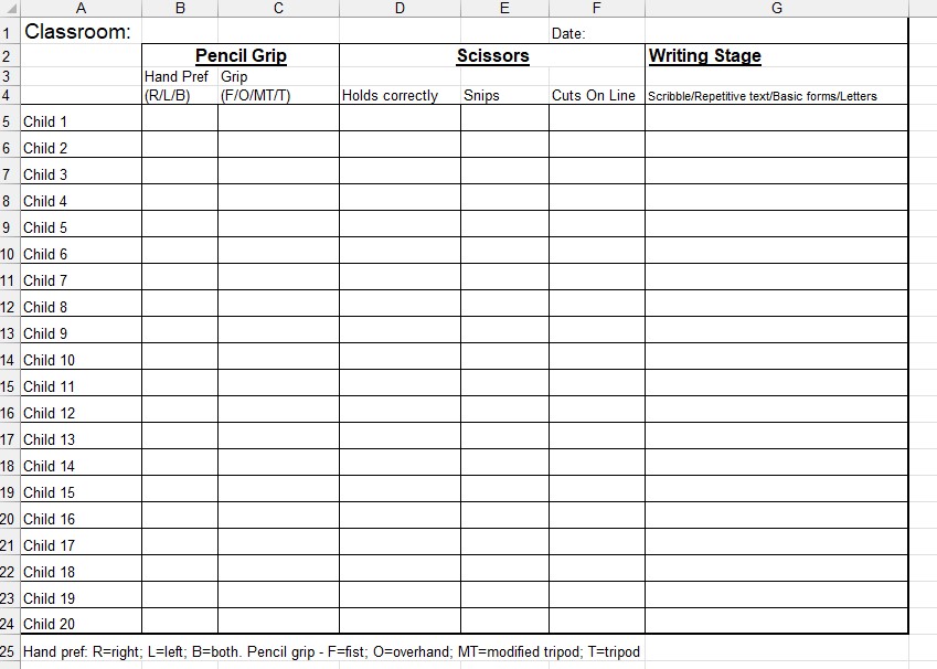 The checklist pictured has places to record information for 20 children. There are columns for teachers to check off specific skills, such as pencil grip, scissor grip, and the writing stage.