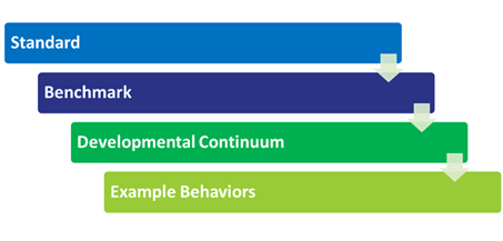 Developmental Continuum – A predictable but not rigid sequence of accomplishments that describes the progressive levels of performance in the order in which they emerge in most children, based on current research. Developmental Continuum items describe how skills related to a Benchmark typically emerge or progress.